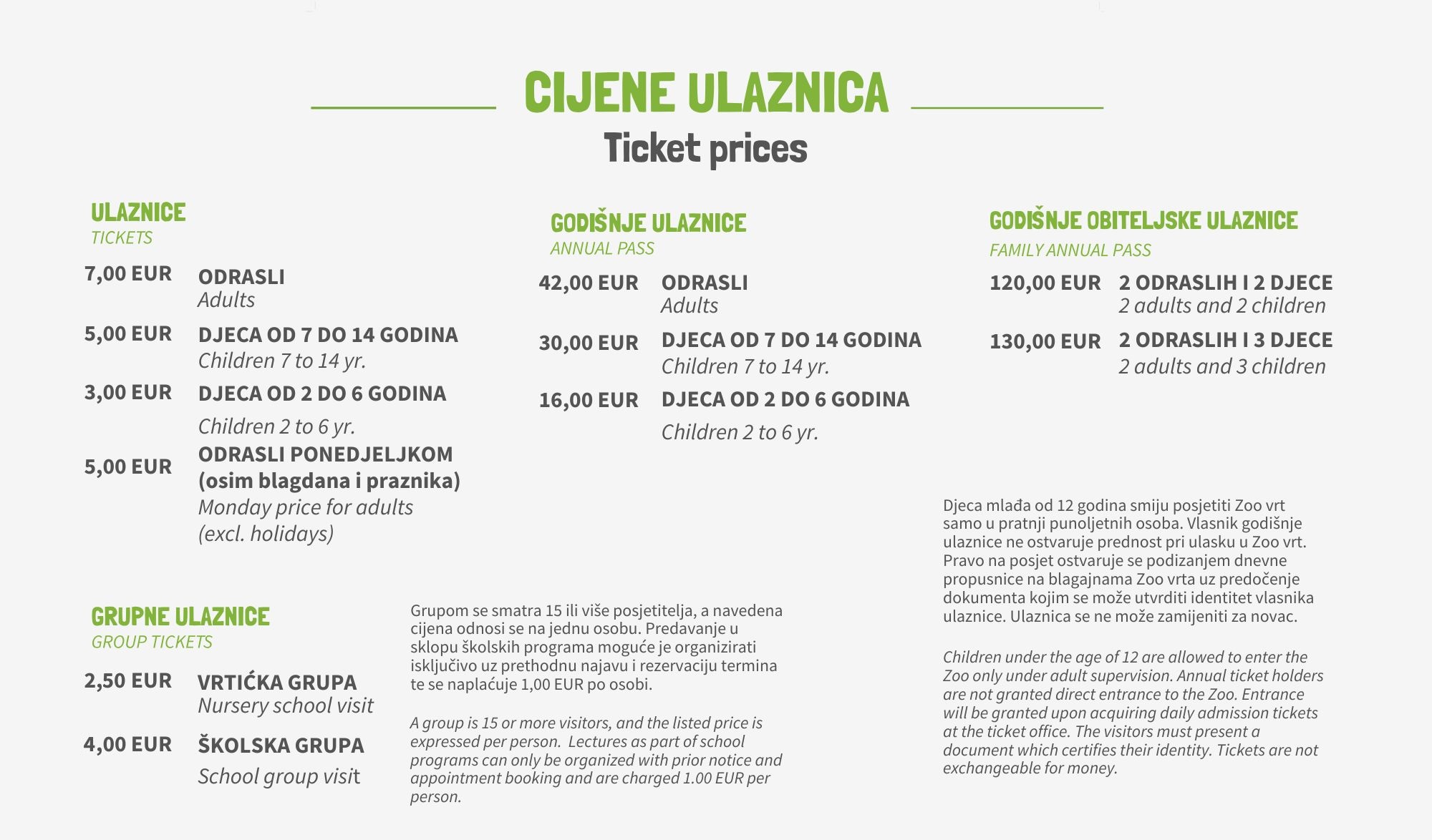 - Pri kupnji ulaznice važeći je cjenik istaknut na blagajni Zoološkog vrta.