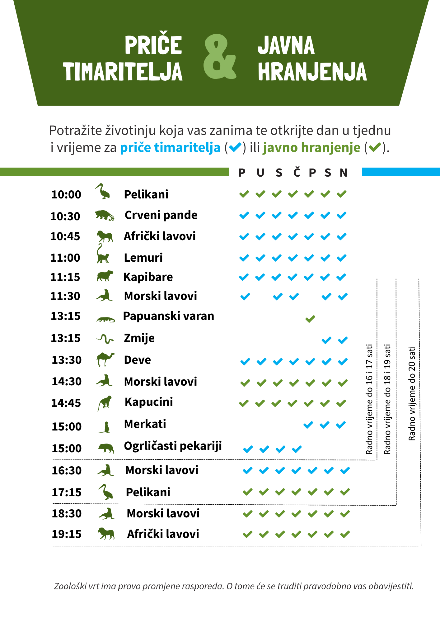 Potražite životinju koja vas zanima te otkrijte dan u tjednu kada je vrijeme za priče timaritelja ili javno hranjenje životinja.